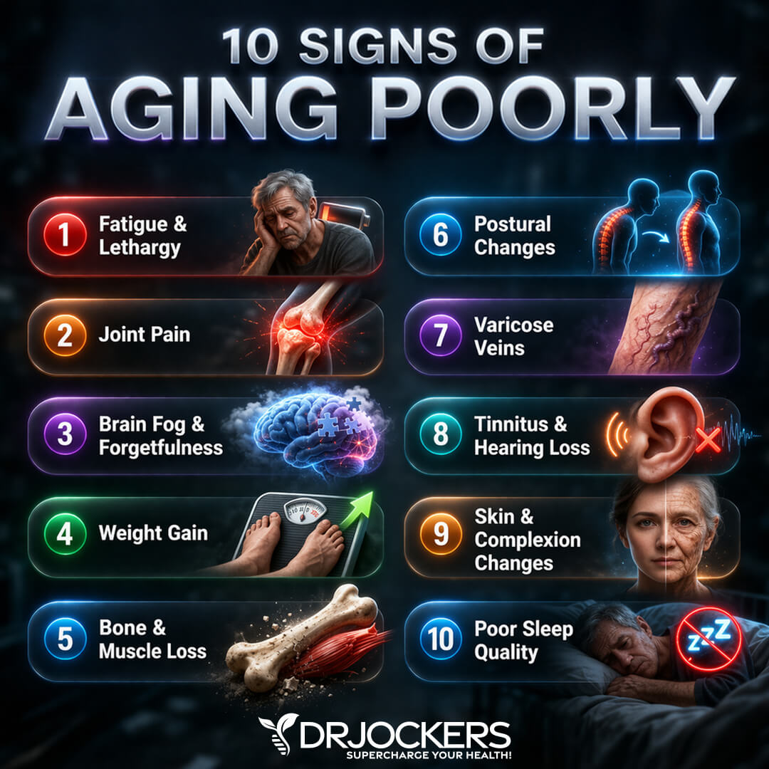 Healthy aging is possible. However, there are 10 signs of aging poorly that society deems normal. Fatigue, joint pain, brain fog, forgetfulness, weight gain, bone loss, and other so-called age-related health issues, however, are not normal. They are signs of aging poorly. Let’s look at the top 10 signs of aging poorly.