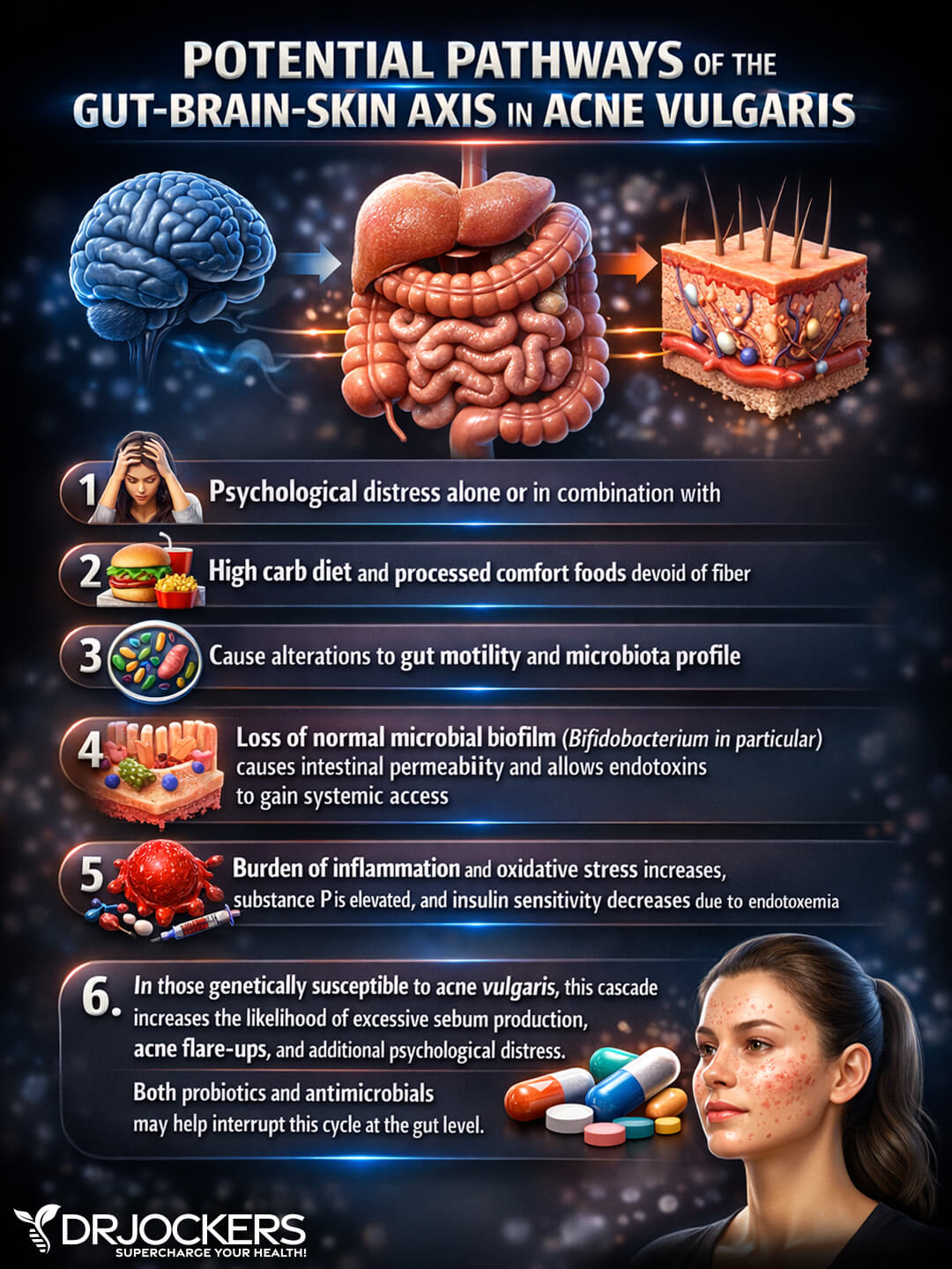 One study involving over 13,000 adolescents showed that those with acne were more likely to experience gastrointestinal symptoms such as constipation, halitosis, and gastric reflux. In particular, abdominal bloating was 37% more likely to be associated with acne and other skin related disorders such as eczema and rosacea (5).
