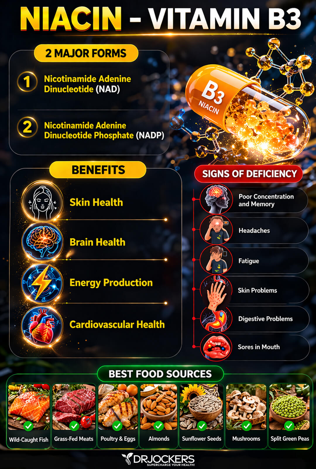 Vitamin B3 is also known as niacin. It is essential for energy production in your body. There are two forms of niacin: nicotinamide adenine dinucleotide (NAD) and nicotinamide adenine dinucleotide phosphate (NADP). Both are necessary for the conversion of dietary fats, proteins, and carbohydrates for energy. Niacin is also necessary for synthesizing starches to be stored in your liver and muscles for energy.