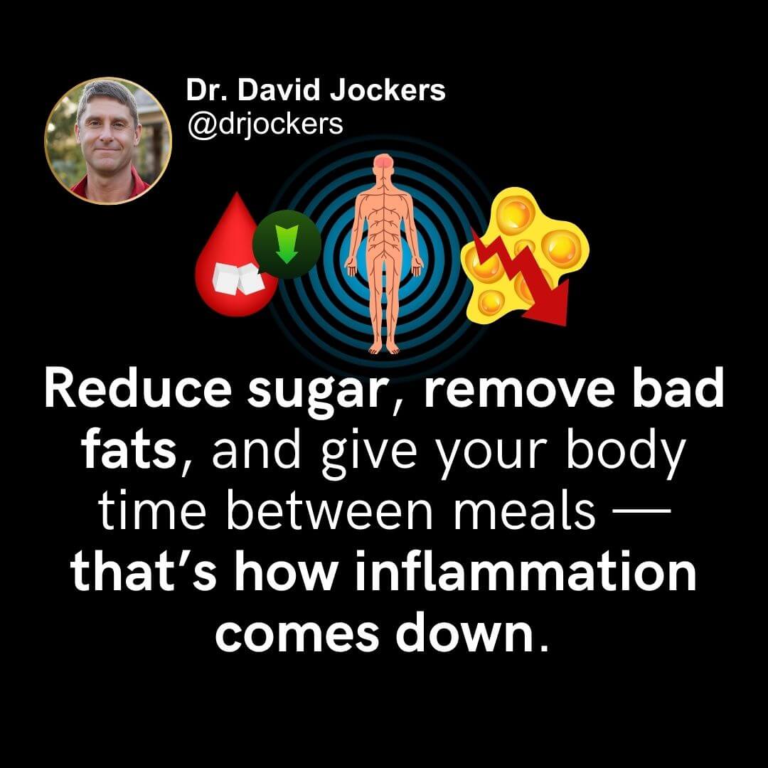 One of the biggest takeaways from this episode is how strongly blood sugar impacts inflammation. Diets high in sugar, refined grains, and constant snacking keep insulin elevated — and when insulin stays high, inflammation follows.
