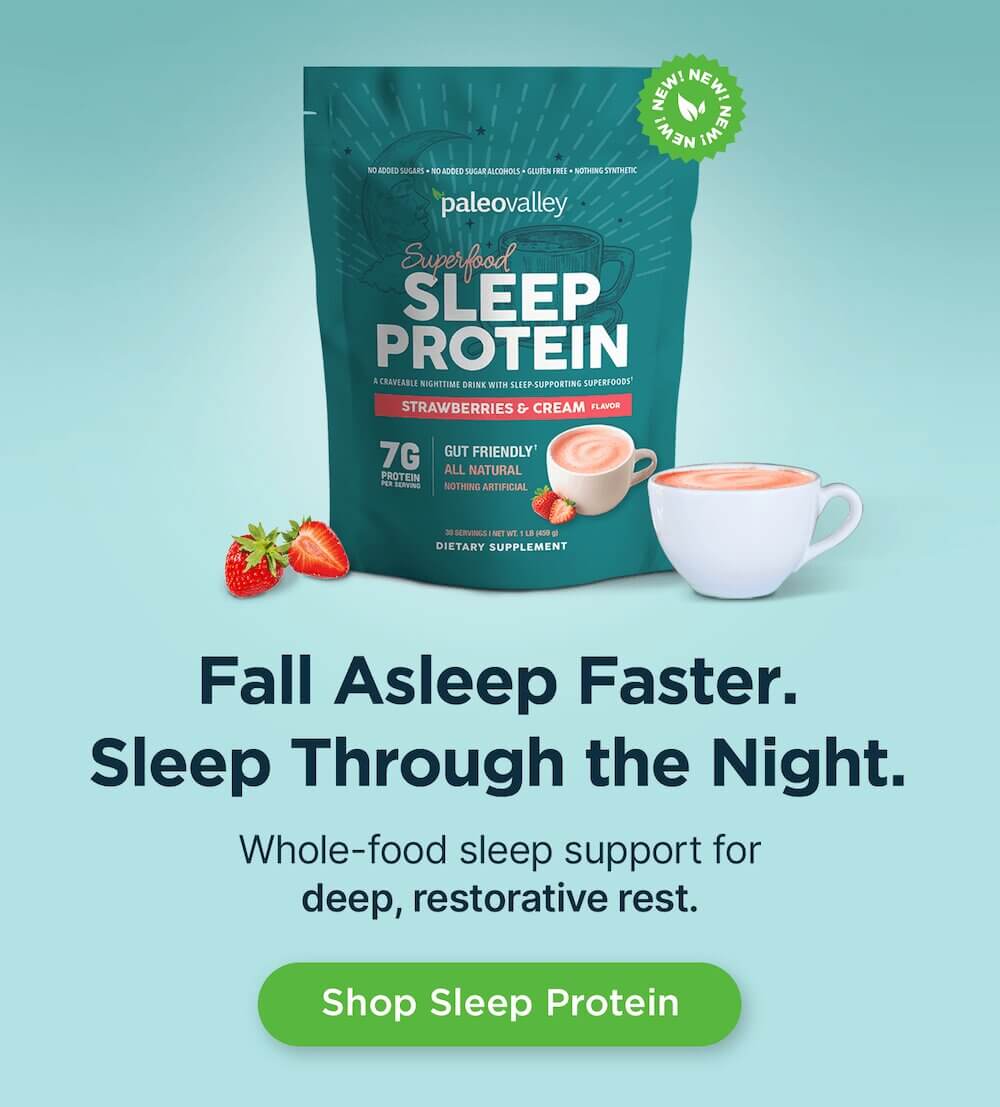Quality sleep is crucial for healing, recovery, and overall health. Paleovalley’s Superfood Sleep Protein supports your body’s natural sleep process with whole food ingredients like melatonin from tomatoes, magnesium for relaxation, and chamomile for stress relief.