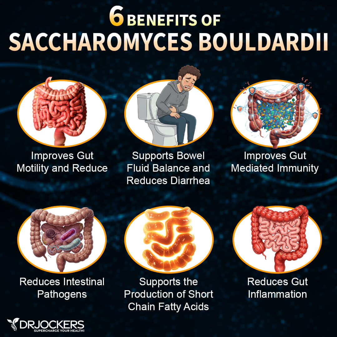 There are many benefits to Saccharomyces boulardii. It improves gut motility to reduce constipation and supports bowel fluid balance to reduce diarrhea (8). Saccharomyces boulardii also reduces gut inflammation and intestinal pathogens while improving gut-mediated immunity (secretory IgA levels) and cytokine balance. It may also have a role in the production of short-chain fatty acids, including butyrate.